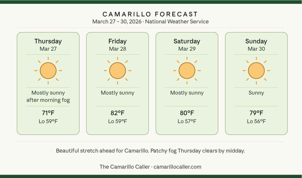 Friday warms up to a high near 82, Saturday hits 80, and Sunday comes in at 79 and sunny. Classic Camarillo spring weather. The mornings have been a little foggy this week thanks to an early marine layer pattern, but it's been clearing out each afternoon.